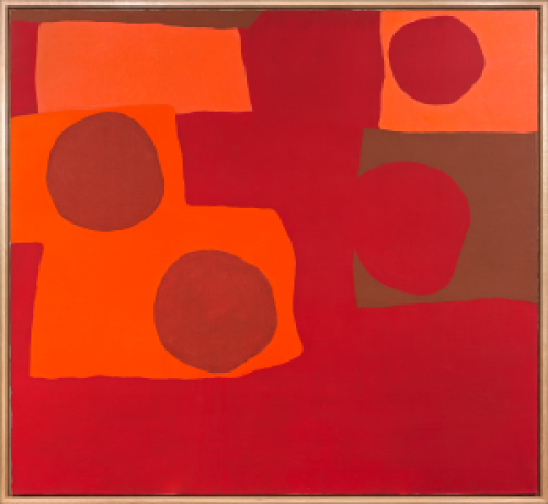 This extraordinary work is one of the first recorded sculptures created by William Turnbull in 1946. A tall, elongated trapezium, the flat, frontal Mask is divided into three tapering triangles; the outer forms bearing deep circular recessions at the centre of raised spirals, suggesting eyes. The third, central triangle is articulated with horizontal lines above a third, semi-circular hollow to the right, with four lines echoing its arc to the left, evoking a mouth or flared nostril. With its textured surface and variegated patina resembling an ancient artefact, Mask, a common theme in non-western traditions, became a recurrent motif in Turnbull’s art. Inspired by the simple forms of archaeological and anthropological objects, as well as pre-classical forms of art, in particular African and Greek theatrical masks, Turnbull created further solid pieces during the 1950s, accentuating their surfaces. The artist declared, ‘the mask is a marvellous example of the attempt to fix that which is maybe most continuously fleeting and mobile – the expression on a face.’[1]