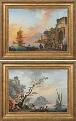 This pair of paintings throws fascinating light on the relationship between Charles-François Grenier de Lacroix, called Lacroix de Marseille, and Claude-Joseph Vernet, in whose Roman studio he worked. The Mediterranean coastal landscape at sunset with a capriccio of the Arch of Titus is signed Joseph /Vernet /1753 on the barrel at foreground right, indicating that Vernet was quite happy to put his name to the productions of his talented associate. The two artists’ styles were extraordinarily close in the 1750s, until Vernet returned to Paris in 1753. Pressure of work in Vernet’s last years in Rome seems to have made him turn over commissions to Lacroix. A series of landscapes of The four times of day commissioned by Sir Matthew Fetherstonhaugh of Uppark, Sussex (in situ) were copied (and signed) by Lacroix, ‘so exact…in every detail of brushwork that were it not for the signature it would be impossible to distinguish them from the master’s works’[1].