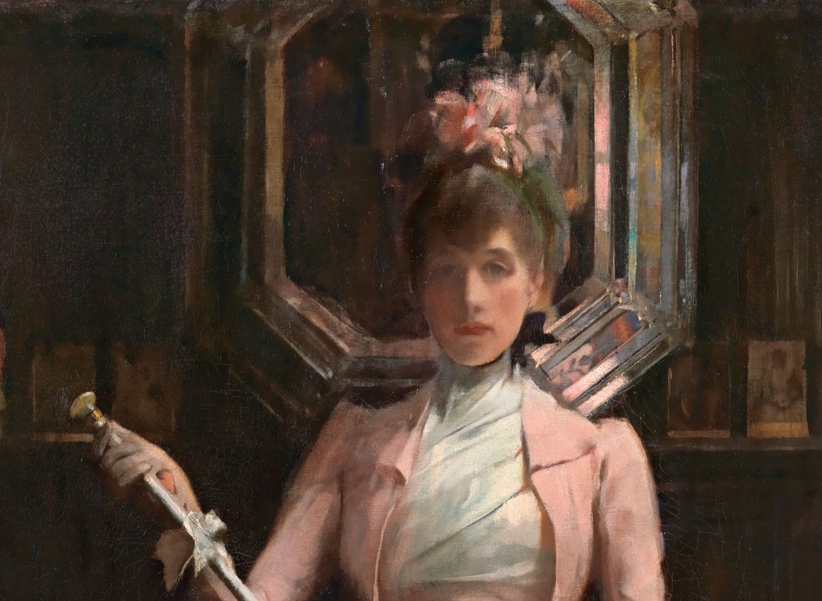 In Rose pink, 1888, James Jebusa Shannon portrays his future wife Florence in an exquisite pink silk taffeta visiting dress. The elegance of her perfect hour-glass figure is complemented by her hat, gloves and parasol, painted with a sensuous freedom that takes its inspiration from Velásquez.