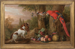 This work, which was probably intended as an overmantel, showcases Bogdani’s skill at painting still life, birds and animals, set within an atmospheric landscape. The mansion in the background is perhaps inspired by the long, baroque façade of William III’s state apartments at Hampton Court, designed by Christopher Wren from 1689. The elements of the composition reflect the aspirations of the Stuart élite. King Charles spaniels, named after Charles II (reg. 1660-85), retained their aristocratic popularity long after his reign. Aviaries of exotic birds, such as the magnificent scarlet macaw (Ara ararauna) to the right of this painting, reflected a courtier’s status. Originally brought back by Dutch sailors in the seventeenth century from South America, macaws were prized for their brilliant plumage and, if kept as pets, for their sociable nature and ability to mimic human language. This macaw is based on one studied in Admiral Churchill’s aviary, for it is shown in exactly the same position in Birds and deer in a landscape, c.1708-10 (Royal Collection Trust), one of eight paintings that Bogdani created for Churchill’s aviary and which were bought by Queen Anne from Churchill’s executors[1].