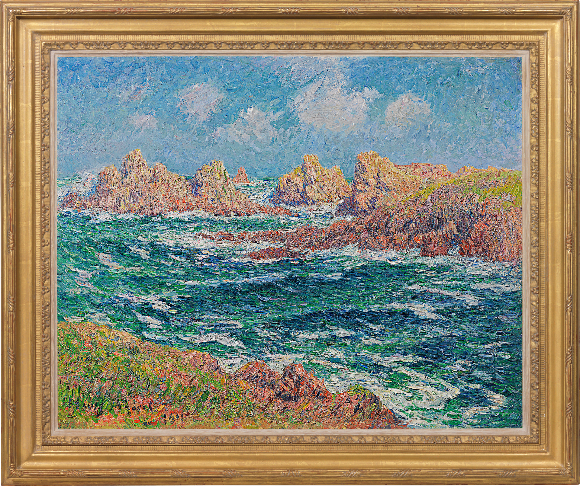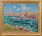This richly-impasted work vividly evokes the dramatic Breton coastline with the jagged rocks and treacherous currents so ably mastered by Breton seafarers. The turquoise and sapphire blue of the channel, flecked with restless foam, is contrasted with the warm tones of seaweed-wrapped rocks and the bright, emerald green of the clifftops.