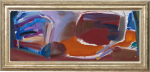 Of the two main areas of interest in this wide landscape format it is likely that one’s attention will first be drawn to the darker one on the right. But its ambiguous depths and blank mystery will soon compel the eye to seek the light and air offered by the left-hand compartment. Here one travels from a hint of water in the foreground to the dark outline of low hills on the distant horizon. Once one has made sense of this, curiosity draws one back to explore further the big purple-brown area on the right and then to discover that it too has depths, obscure though they are. This alternation between the two contrasted vistas is underpinned by colour - warm brown to cool blue and back again - and by shape - the brown mass on the right, with its curving foreground of Venetian red, being an inversion of the haystack shape on the left, the two linked by a semi-circular cushion, half brownish, half blue. But this is not all. A channel of Venetian red leads the eye to the far right of the picture where another distant vista is revealed at the base of an upright triangle of blue.