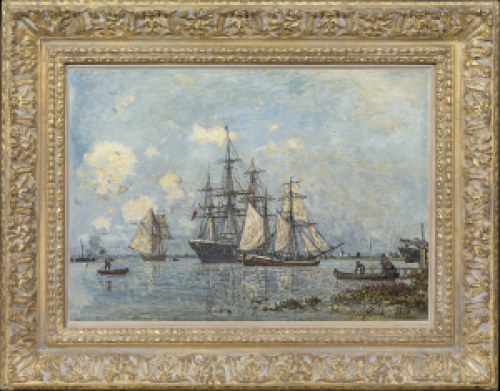 Born in Honfleur, Boudin was the son of a harbour pilot and bred to the sea, working as a cabin boy for his father in his boat Le Polichinelle. After a brief period of schooling, in 1835, he worked with a stationer and framer who displayed the work of artists, then set up his own stationery and framing business in 1844. Boudin’s clients included Thomas Couture, Eugène Isabey, Jean-François Millet and Constant Troyon, all of whom had an influence on his efforts to draw and paint. In 1847 Boudin went to Paris to copy Old Masters in the Louvre; he was particularly impressed by the seventeenth century Dutch school and by the Barbizon painters. In 1851 he was awarded a three-year painting scholarship by the city of Le Havre. He drew his subjects from the Normandy and Brittany coasts. In 1858 he met the young Claude Monet, who had grown up in Le Havre, and stressed to him the importance of making oil paintings directly from nature to capture the constantly changing beauties of the landscape. Boudin and Monet went on painting expeditions together, especially at the Saint-Siméon farm near Le Havre.