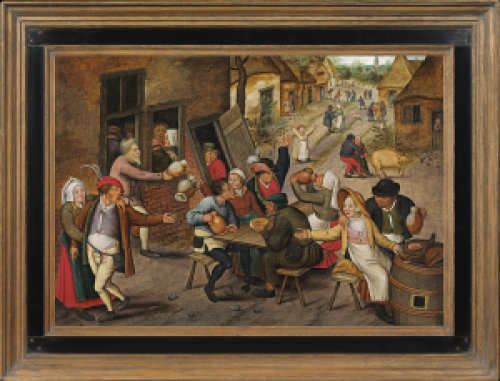Jan Brueghel the Elder was a prolific and highly influential artist, known in his day as ‘Velvet Brueghel’ for his delicacy of handling and ‘Paradise Brueghel’ for his many paintings on this subject. His early forest scenes were influenced by Gillis van Coninxloo III (1544-1607); he also produced Biblical paintings which adapt elements of his father’s work into his own miniaturist style. Crowded scenes of Hell were influenced by frescoes observed in Italy, for example Michelangelo’s Sistine ceiling and Luca Signorelli’s work in Orvieto. Jan painted panoramic landscapes, beginning with a high, detached viewpoint but moving in the first decade of the seventeenth century towards a more naturalistic and direct engagement with nature, informed by veils of atmosphere. Also in that decade, he pioneered flower painting that was independent of any Biblical or heroic context. Jan’s flowers are superbly observed over several months and then placed together in a convincing bouquet; in one of his letters to Cardinal Borromeo, he mentions travelling specially to Brussels to draw some particularly rare floral specimens from life. Brueghel also executed many views of village life; market days, travellers on the road and festivals are presented with a refinement that would appeal to the élite for whom he painted.