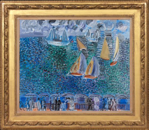 This powerful work depicts the suspension bridge over the Seine at Elbeuf, just south of Rouen in Normandy. Warm afternoon light brings out the colours in the shadows playing over the central pillar of the bridge, the old houses on the further bank and the myriad shimmering reflections of the river. Loiseau varies his brushwork, from a dotted, almost Pointillist technique in the water, to richly interwoven, looser strokes to evoke the radiance of the sky. The result is a scene vividly alive with the vibrant manner of Post-Impressionism.