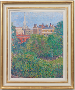 From 1910 to 1912, Spencer Frederick Gore rented a room at 31 Mornington Crescent (a few doors from his close friend and fellow founding member of the Camden Town Group, Walter Sickert) and while there, painted the view from his first-floor window looking across the crescent gardens throughout the year. At least a dozen paintings of the subject are known, including works in the collections of the British Council, the Museum of London, Tate, Leeds City Art Gallery, National Museum of Wales, Cardiff and the Museum of Fine Arts, Boston. Frank Rutter in his review of Gore’s solo exhibition at the Chenil Gallery in 1911, noted that ‘it is the hall-mark of the true artist that he does not have to wander far afield in search of beauty. He finds it ever waiting for him at his own door, as Mr Gore has found it in his exquisite Mornington Crescent series.’[1]