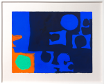 Against a sea of ultramarine and cerulean blue, one soft-edged, mint green ‘lopsided disc inside an uneven square’ of blazing orange, glows in the bottom left corner, a favourite shape (or colour-form) of the artist.[2] The complex watery depths and fiery delights of this striking gouache brilliantly demonstrate the fluidity, vibrance and opacity of the medium and Heron’s mastery of it.