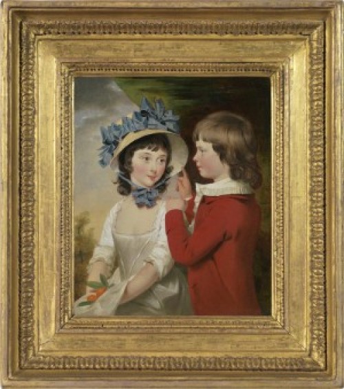 This charming painting of the three daughters of the widowed Charles Cope Jenkinson is by George Henry Harlow, the talented pupil of Sir Thomas Lawrence (1769-1830). It combines the grandeur of aristocratic group portraits of children, seen in the work of Sir Anthony van Dyck (1599-1641) and Sir Joshua Reynolds (1723-1792), with a newly Romantic appreciation of the personalities and psychology of the young. The eldest, motherless girl, Catherine, looks down gravely at her ebullient youngest sister Louisa, who is intent on tangling herself in a curtain of golden satin. Selina, the middle child, shyly peeps out from behind her sibling’s skirts, entwined both physically and by family affection. The children are accompanied by a huge, friendly mastiff. They stand on a lavish carpet of English manufacture, against a fictive window with rolling countryside and a stormy sky, its energy reflecting the freshness of their youth.