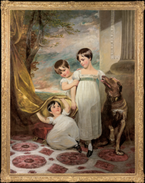 John Downman is now best known for his small, oval portraits in black chalk and stump, drawn on very thin paper and tinted with watercolour on the reverse to give the effect of translucent skin tones. In the earlier part of his career, however, he often worked in oil on panel or copper. This superbly preserved double portrait reflects the economy and classical delicacy of line which Downman had developed after studying in Rome in the company of Joseph Wright of Derby from 1773-4. It also shows the sympathy and humanity which he brought to portraits of children. Downman excelled at the double-portrait format, here bringing a touching sense of familial affection. Isabella looks tenderly at her young brother as he holds forth on some enthusiasm.