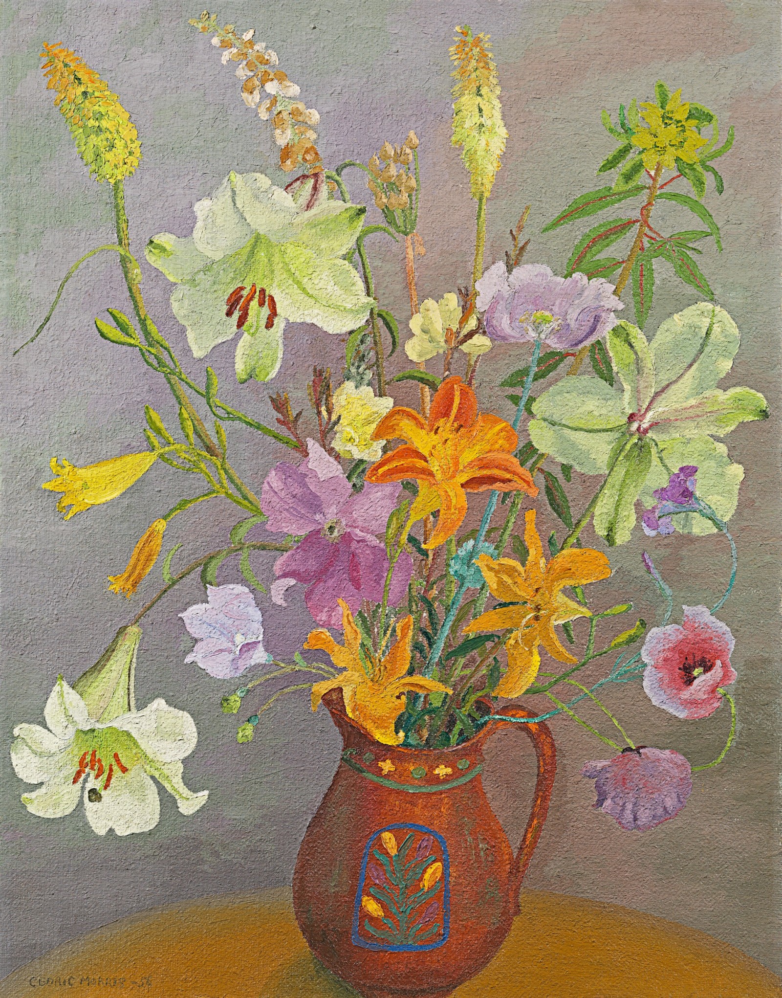 A still life of tulips, roses, lily-of-the-valley, anemones, martagon lilies and other flowers in a basket