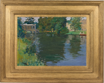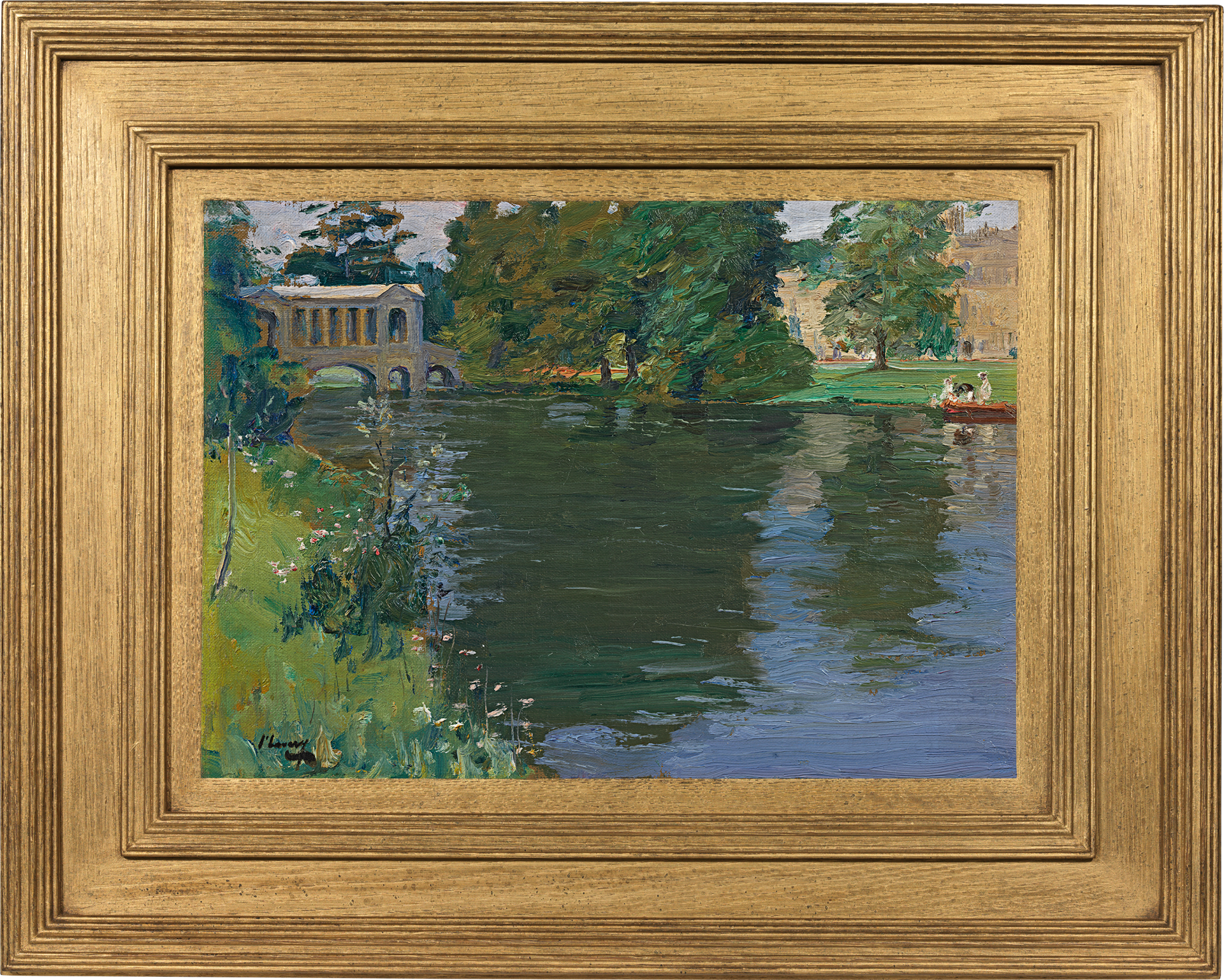Six months later, working on the present picture, the tensions of Tangier were a world away and Lavery’s exile to the far bank of the Nadder resulted in a work that carries all the qualities of more imposing canvases such as The Wharf, Sutton Courtenay 1916 (Hugh Lane Gallery, Dublin) and The Thames at Maidenhead, 1913 (Private Collection). A year later, in the catalogue of Lavery's exhibition at the Alpine Club Gallery, Churchill would describe Lavery as 'a plein-airiste if ever there was one, painting entirely out of doors, with his eye on the object and never touching a landscape in his studio … he is so quick that no coy transience of an effect can save it from his clutches … In consequence there is a freshness and natural glow about [his] pictures which give them an unusual charm'.[10] Garden scenes were at this point, much more Lavery’s forte than portrait-interiors and the concentration that carried him through the Van Dyck detail of the great saloon, was relaxed when he crossed the Palladian Bridge and, on the riverbank, found his ideal spot.