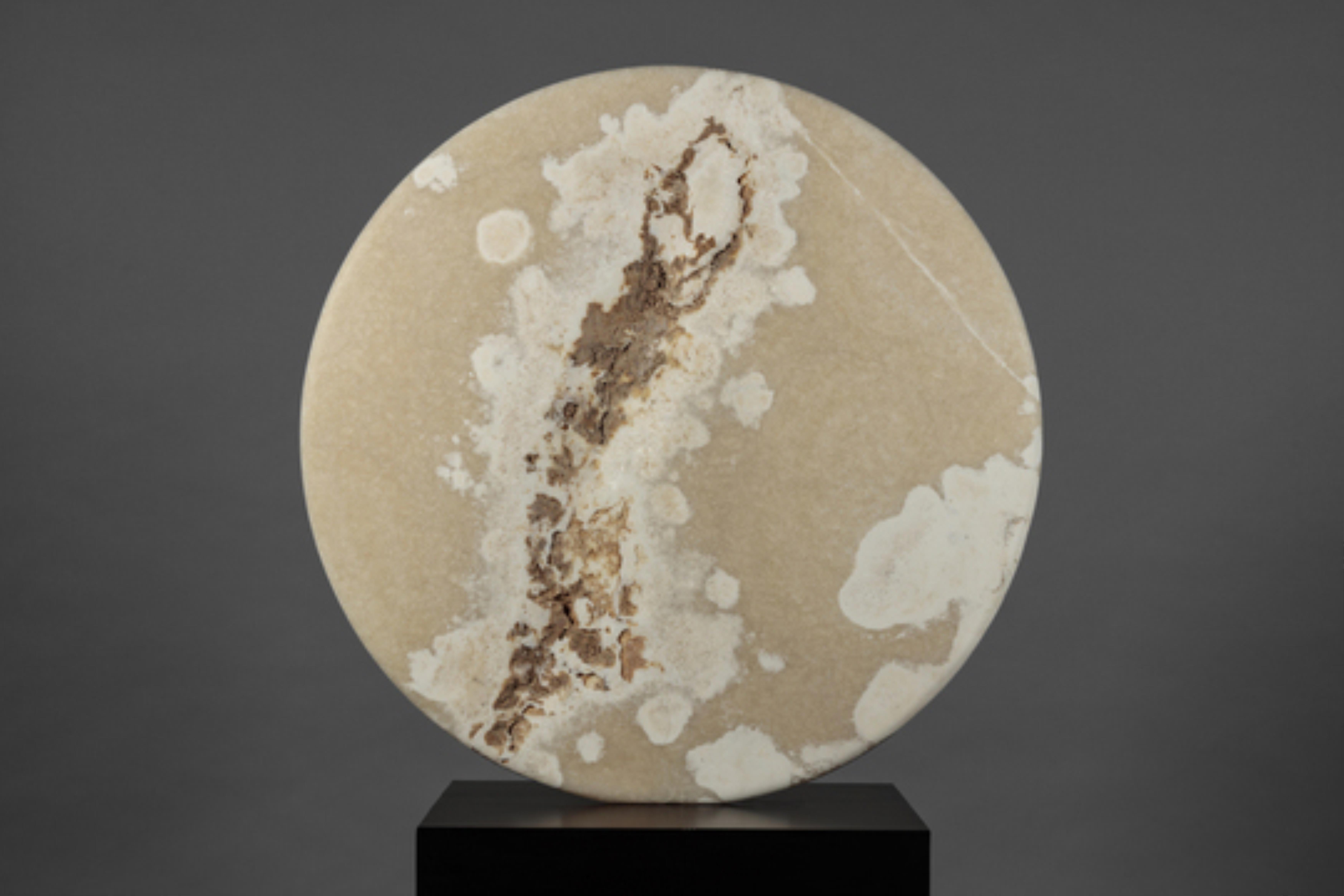 Emily Young with 'Jupiter Disc III, 2025' at The Artist's Studio, Italy. Photograph by Joshua Jara